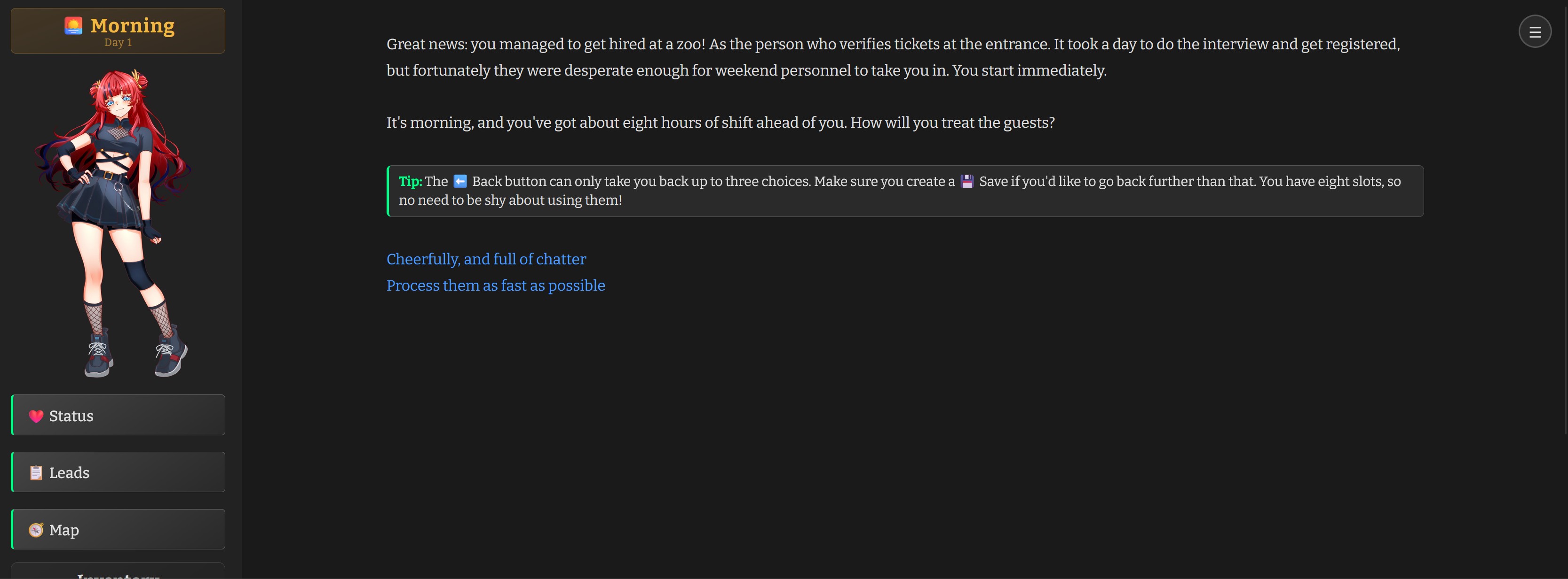 Note: In the current version of the game, only the Status button has much use, but I've decided to keep all of them unlocked anyway to give you a feel for what the UI might look like in a finished version of the game. Mobile devices are largely supported but may have a few graphical glitches.